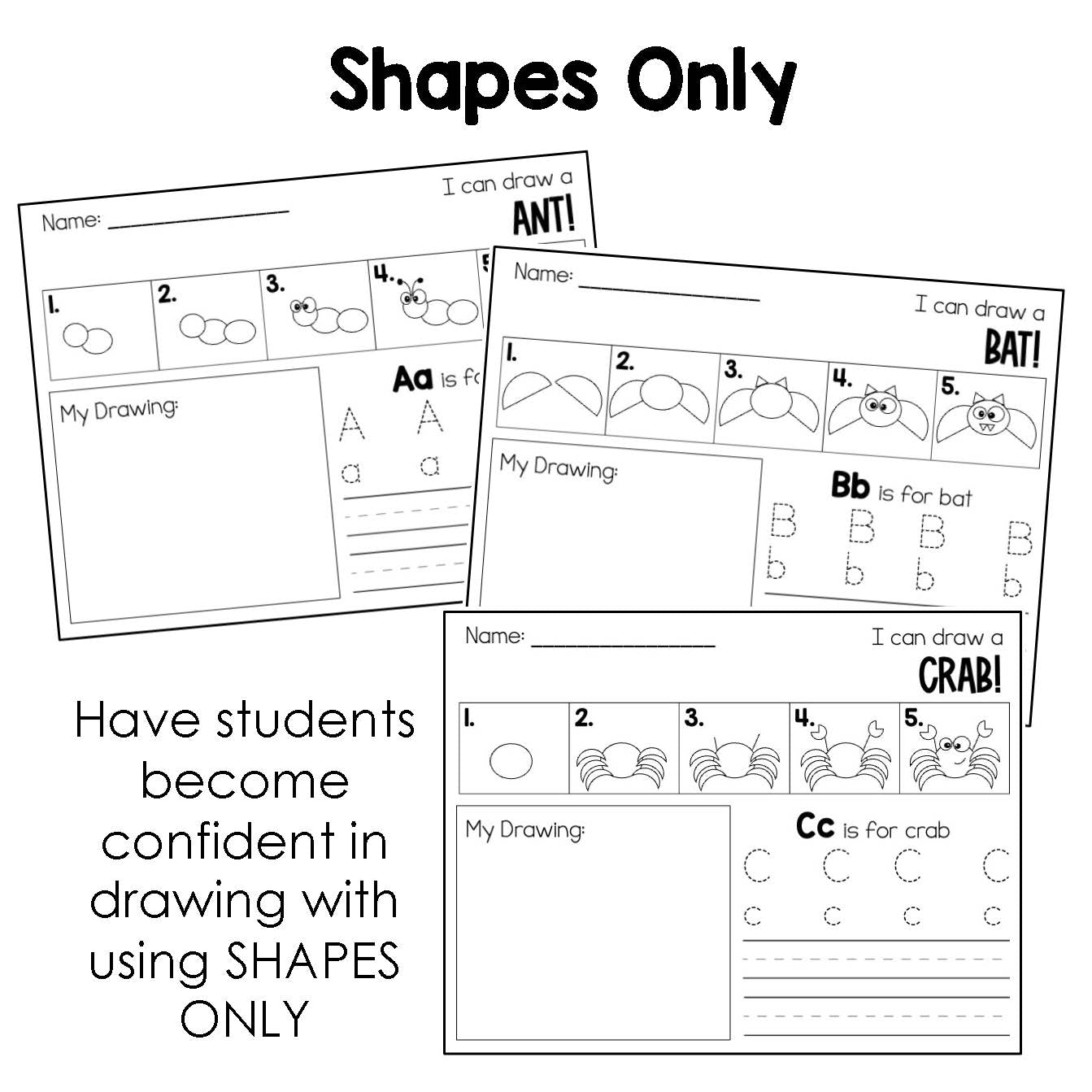 These are simple directed drawings with shapes ONLY. Perfect for kindergarten students to continue gaining confidence in their drawing abilities while also practicing letter recognition, handwriting, and sentence writing. Add these directed drawings to your reading or craft centers to give your students hand on experiences.