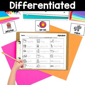 This is an Alphabet Write the Room themed writing center. Use these alphabet words in your kindergarten or primary classroom to keep your students engaged during reading centers.