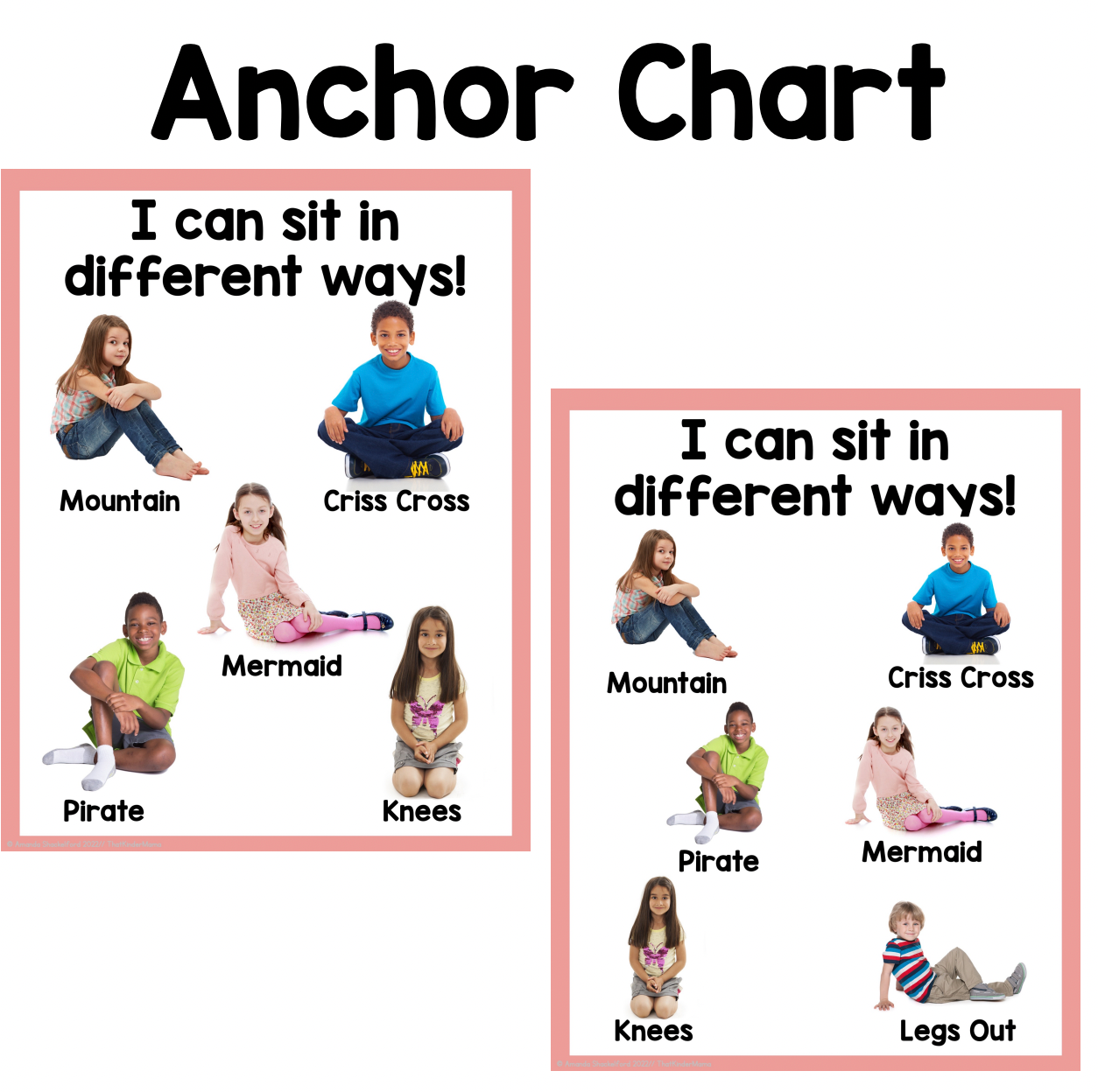 - 1 anchor chart of all the sitting options together (you can print this as a huge poster to keep by the front of your whole group learning area)