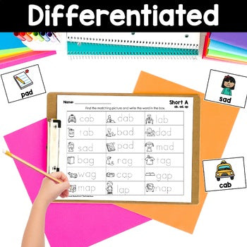 This is a CVC Write the Room themed writing center. Use these CVC words in your kindergarten or primary classroom to keep your students engaged during reading centers.