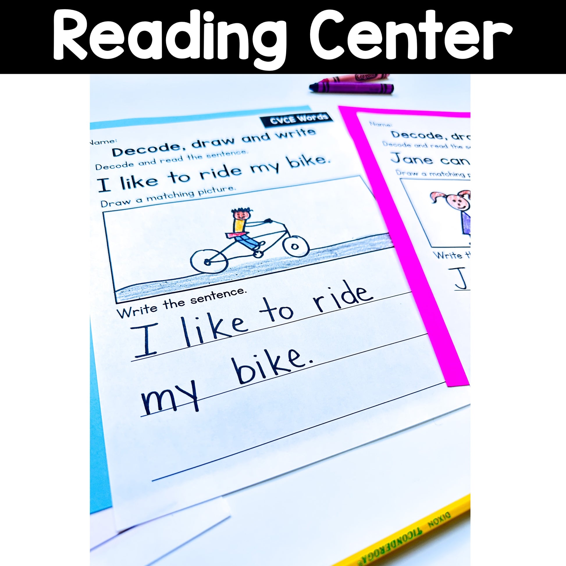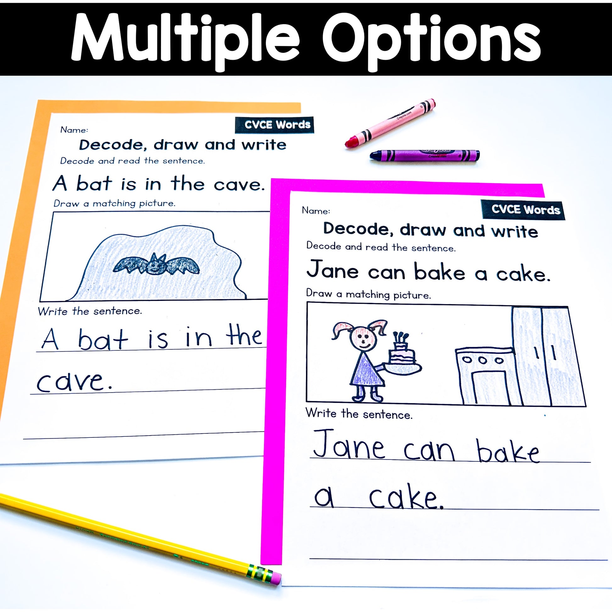 These are 30 pages of decoding CVCE words practice. Perfect for kindergarten or first grade students to practice decoding blends, drawing a matching picture and writing a sentence.