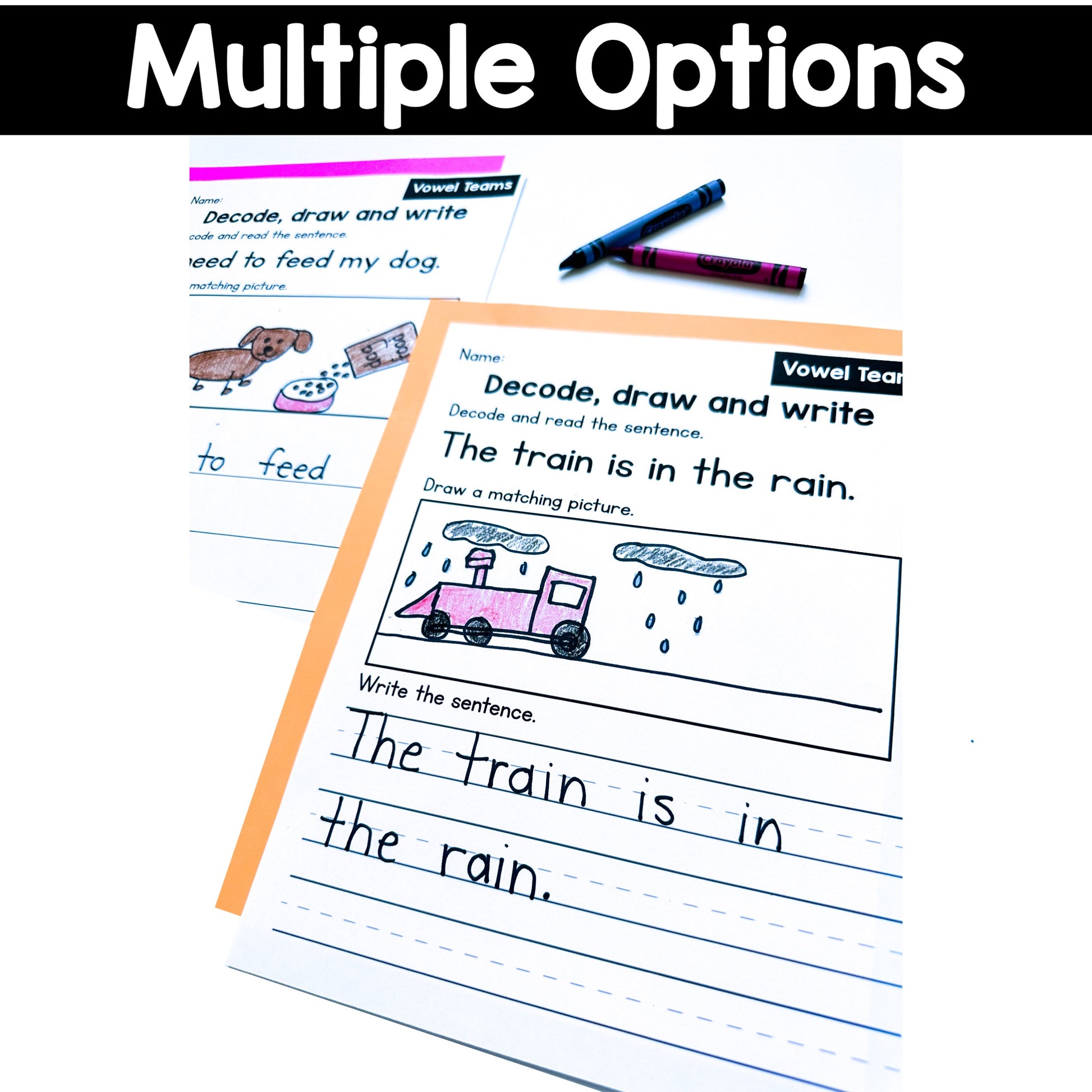 These are 30 pages of vowel team words practice. Perfect for kindergarten or first grade students to practice decoding blends, drawing a matching picture and writing a sentence.