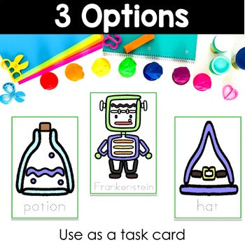 - Halloween Pictures Used:bat, cat, bones, broom, cauldron, Frankenstein, potion 1, potion 2, pumpkin, skull, spider, web, witch, hat, ghost