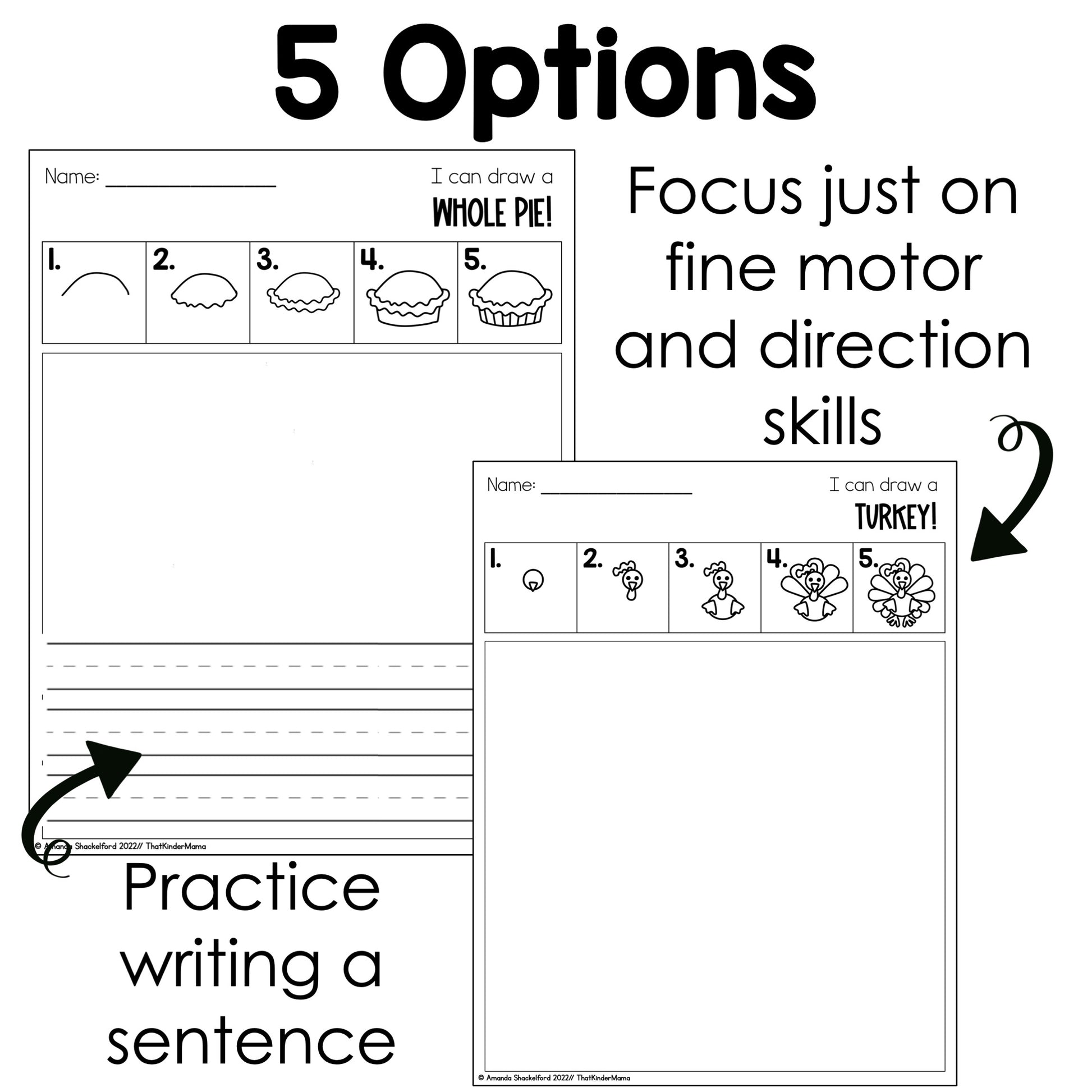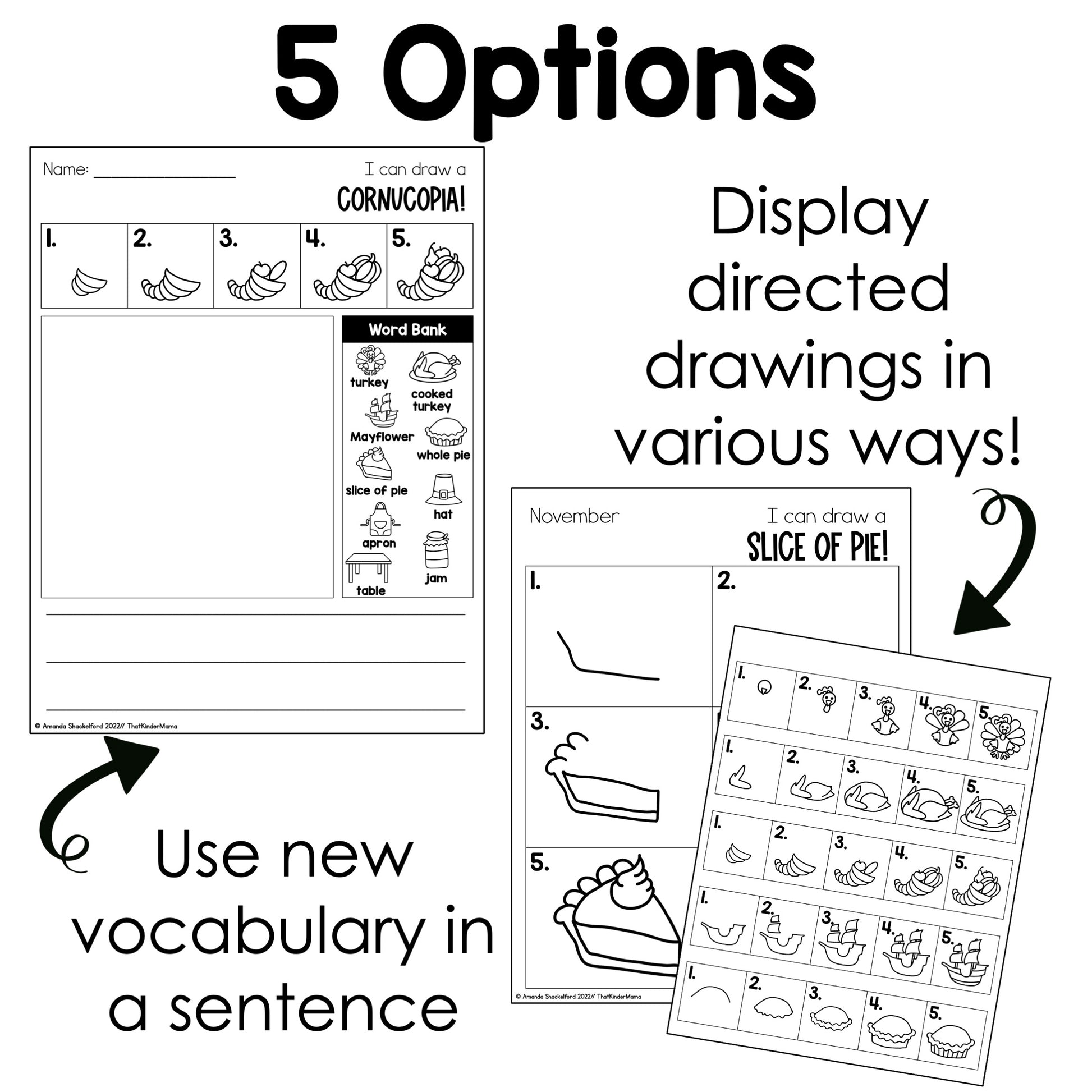 These are November directed drawings. Perfect for kindergarten students to continue gaining confidence in their drawing abilities while also practicing fine motor skills, following directions, sentence writing or building vocabulary. Add these directed drawings to your reading or craft centers to give your students hand on experiences.