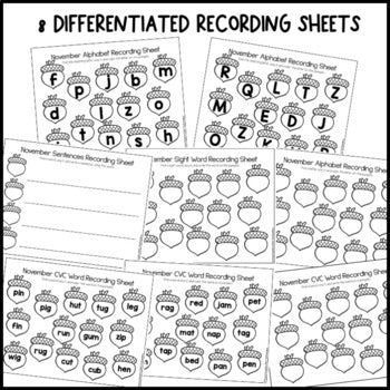 This is a differentiated November/Fall sensory bin reading center. Students can practice alphabet letter recognition, letter tracing, sight words, sentence writing, and CVC words with this differentiated literacy activity.