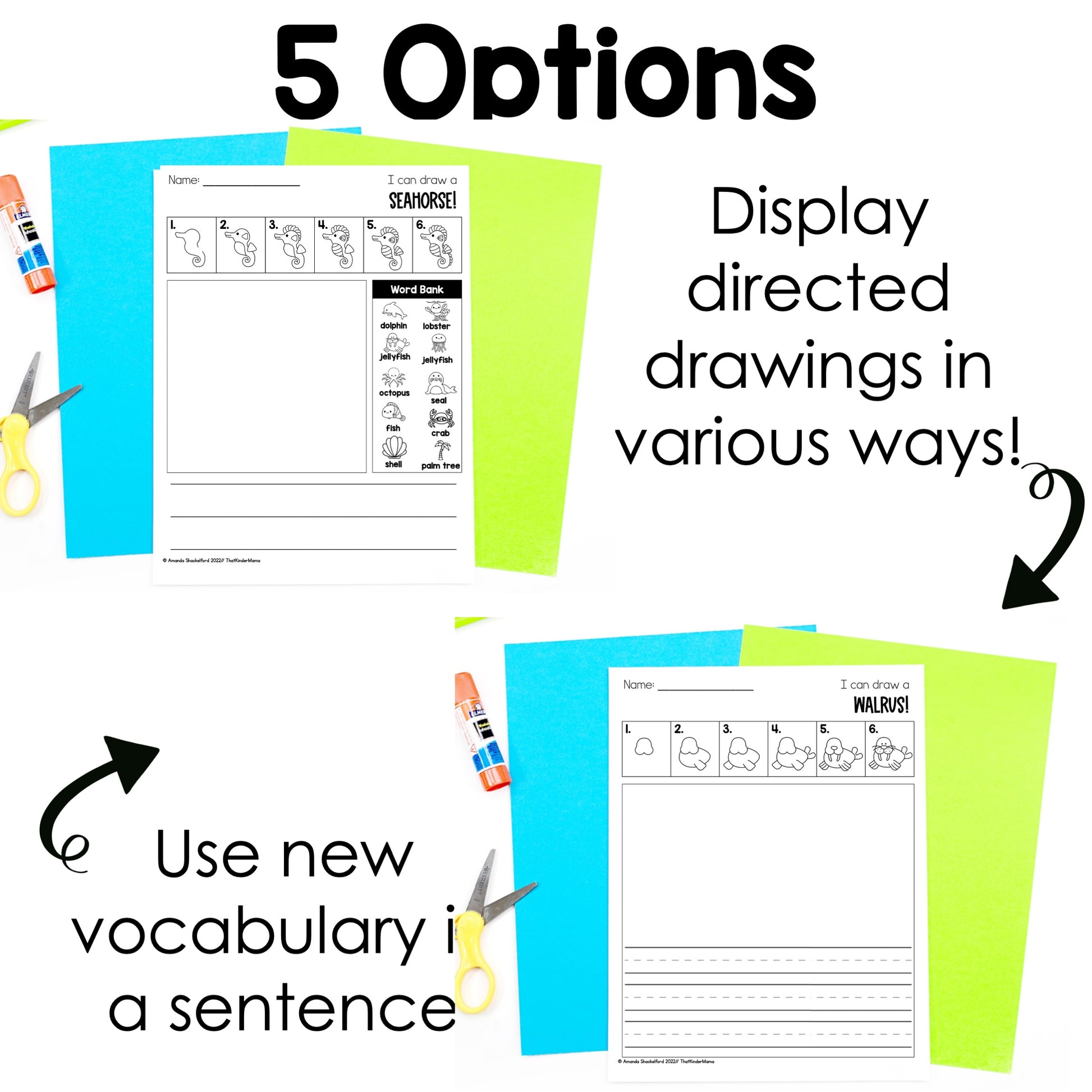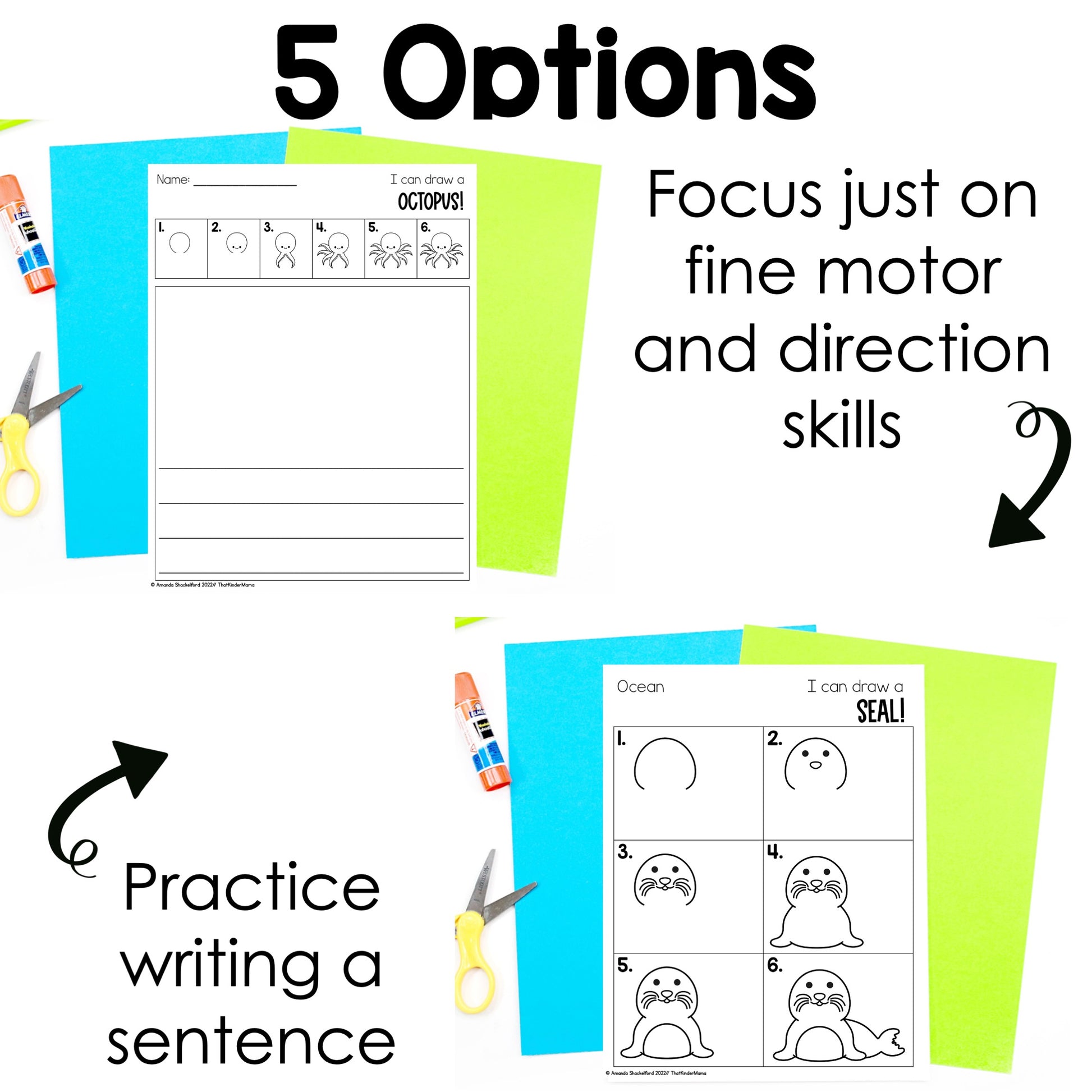 These are Ocean Directed Drawings. Perfect for kindergarten students to continue gaining confidence in their drawing abilities while also practicing fine motor skills, following directions, sentence writing or building vocabulary. Add these directed drawings to your reading or craft centers to give your students hand on experiences.