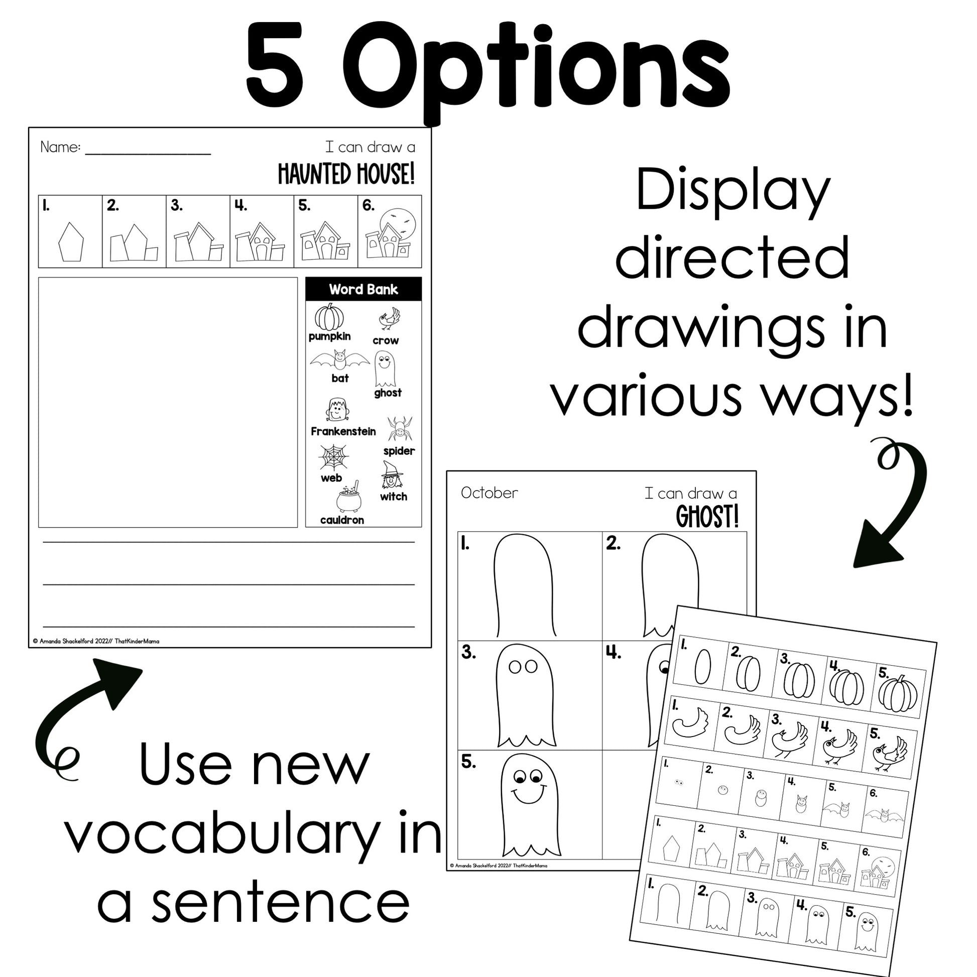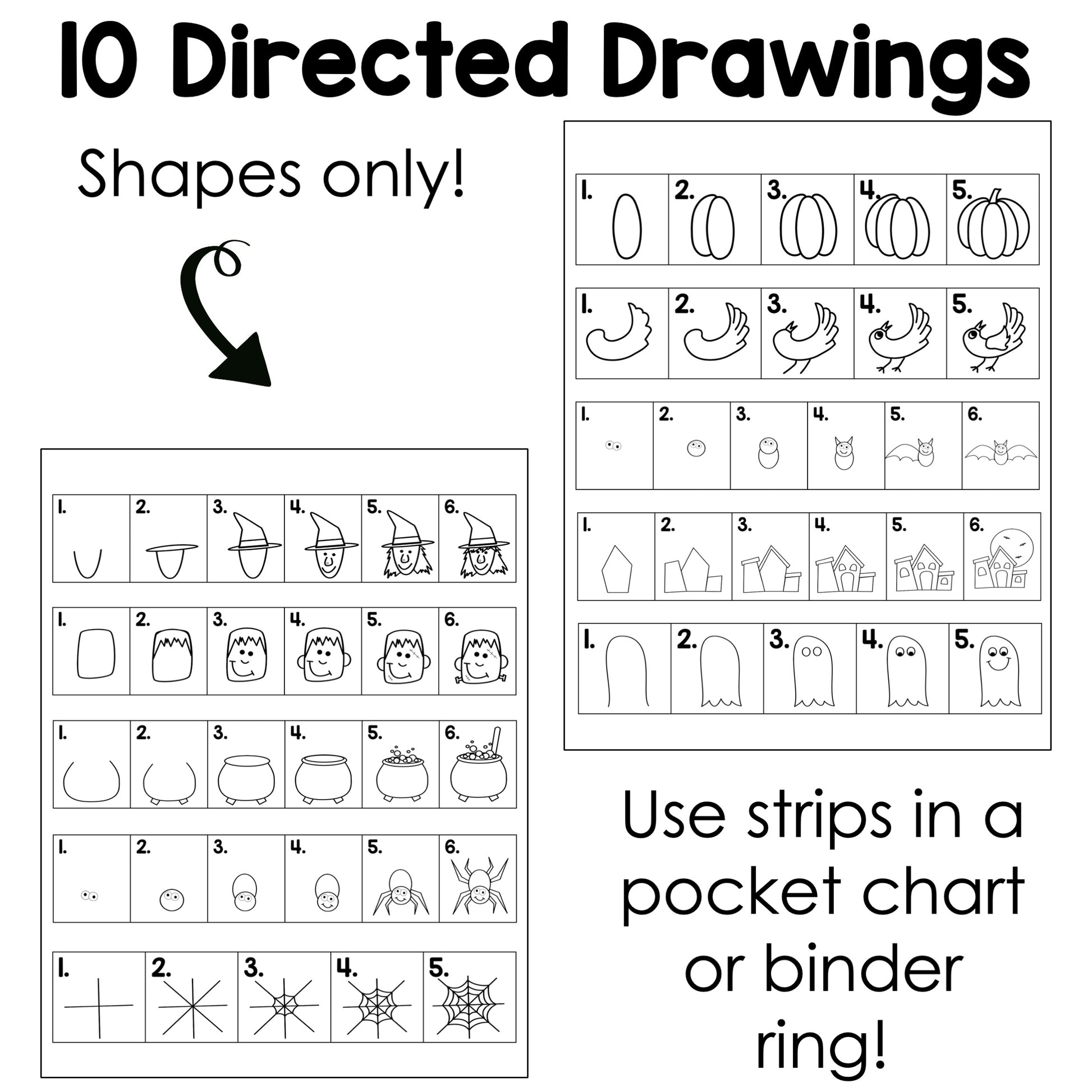 - 10 October directed drawings: pumpkin, crow, bat, haunted house, ghost, witch, frankenstein, cauldron, spider, spider web