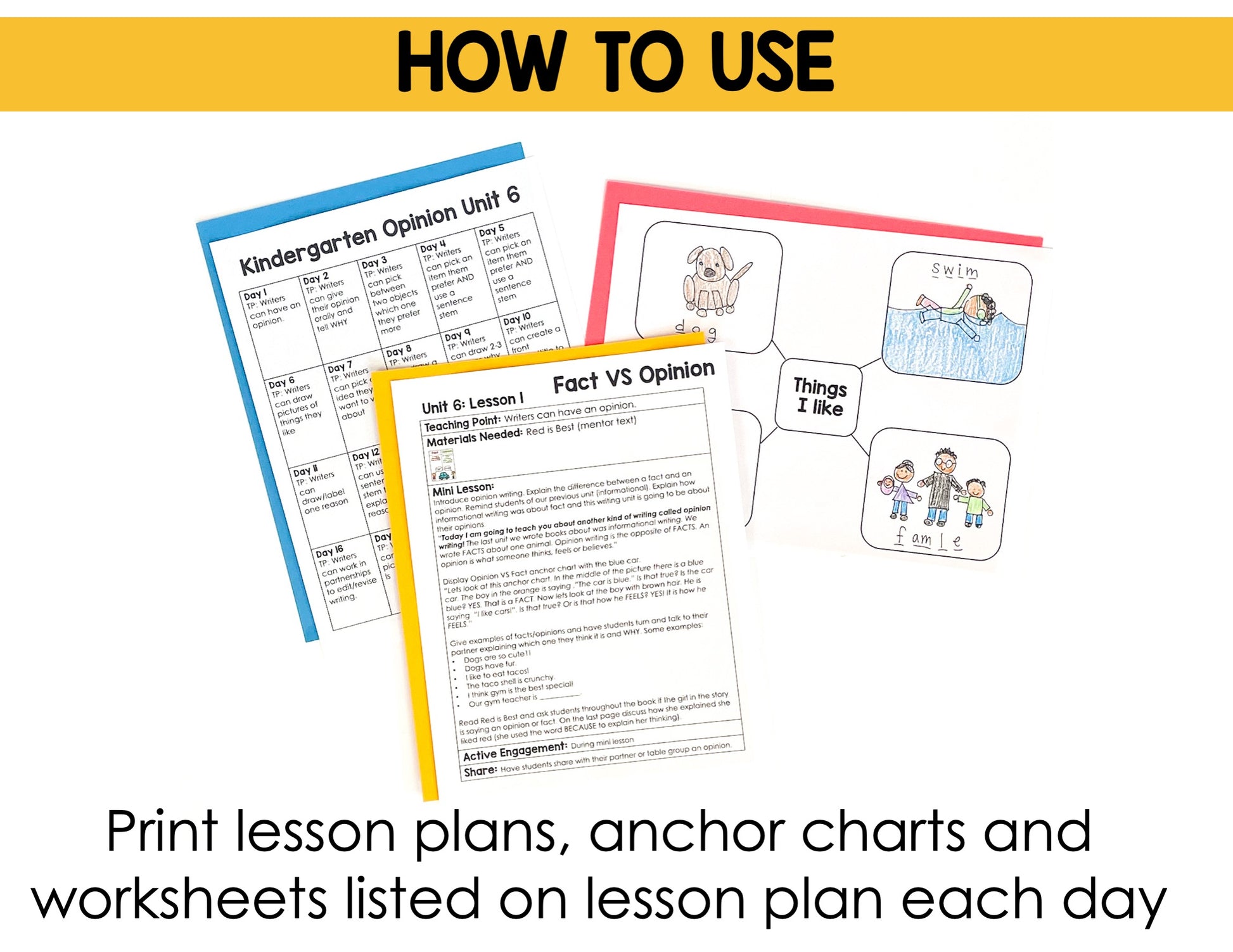 - 11 anchor charts (fact/opinion, what is your opinion, opinion sentence starters, opinion checklist, writing feedback, coloring checklist, sentence checklist, how to stretch out a word, using a sentence stem, how to write a sentence)
