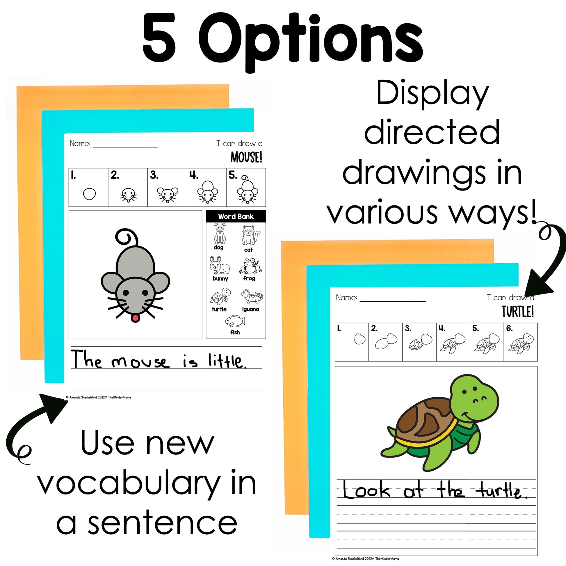 - Directed Drawings used: dog, cat, mouse, bunny, frog, turtle, iguana, and fish