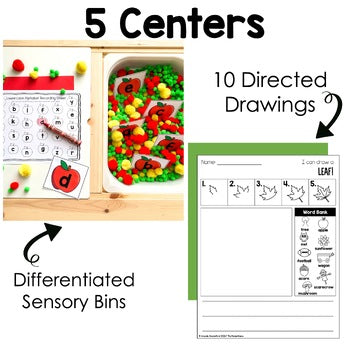 These are differentiated September reading centers for the kindergarten classroom. Students can review letters/sounds, sentence structure, writing a sentence, and drawing all fall long!